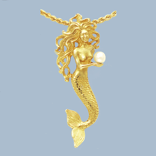 This beautiful mermaid is carved in full detail on front and back. Your choice of white pearl or black pearl. Please call us for custom gems; diamonds and colored gems of your choice! Measures 1 3/4" (chain not included).