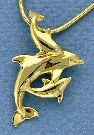 Two baby dolphins swimming playfully with mom. Over 1 1/2" top to bottom. (chain not included)